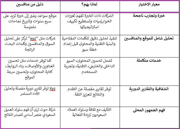 اختيار افضل شركة سيو لا يعتمد فقط على السعر؛ بل على خبرة الشركة وشفافيتها وتقديمها لخدمات متكاملة. وفقاً لأبرز المنافسين، يجب مراعاة الآتي: